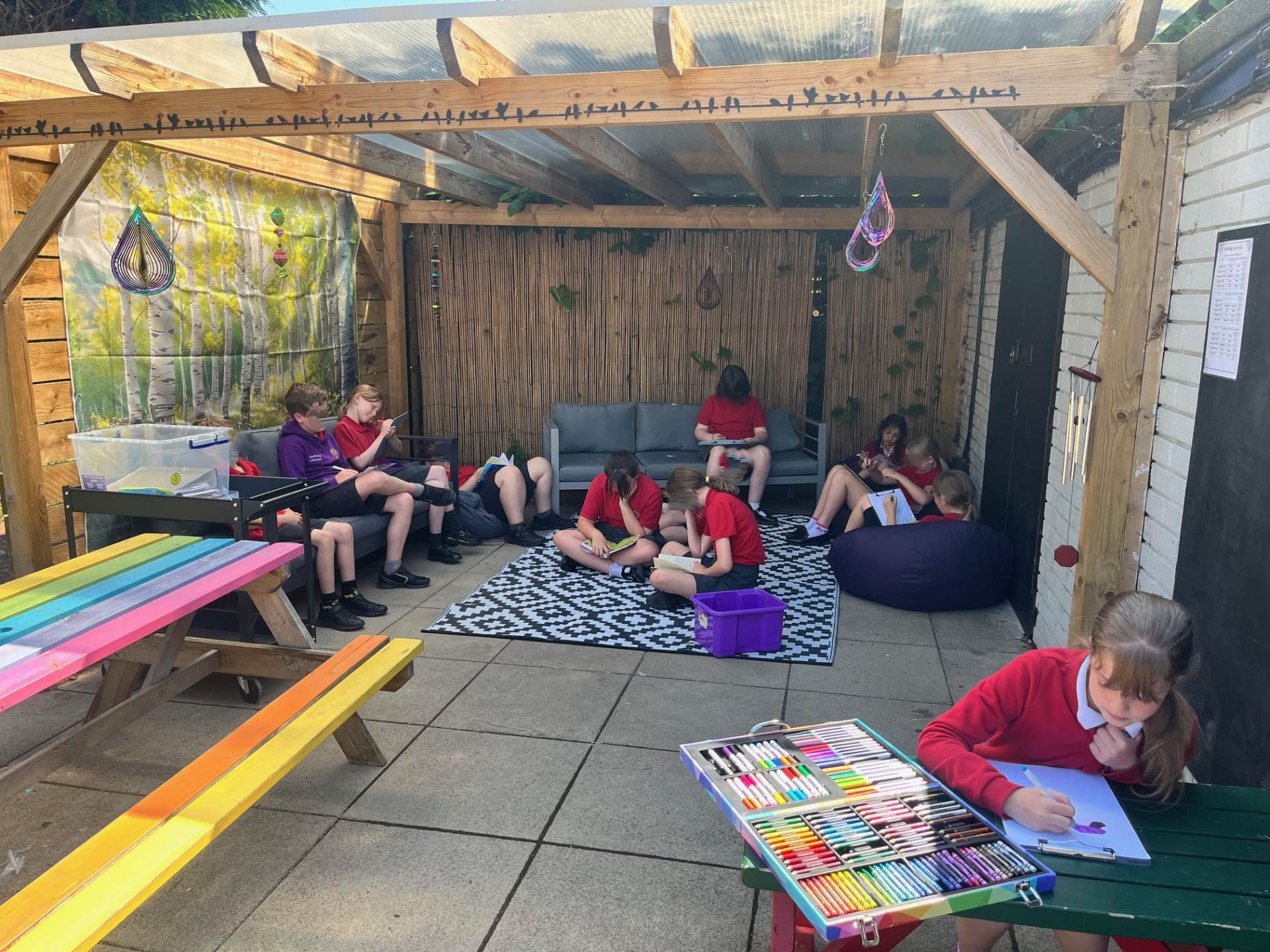 Our wellbeing area: Following a pupil voice survey which highlighted the children's desire for somewhere calm to go at breaktimes, the wellbeing champions created a wellbeing area on the playground. It includes books, art materials and games and puzzles.